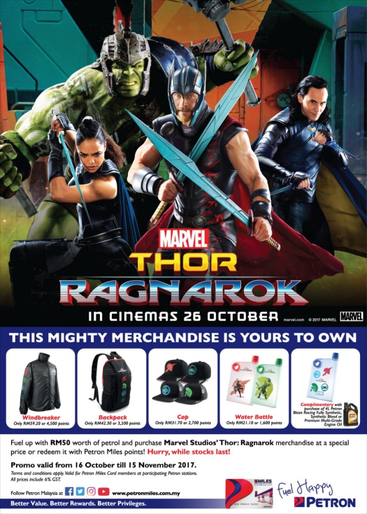 又来到小编的「每周打油送好康」分享啦~ 从即日起至15/11到PETRON打油的Thor迷们,有一系列的Thor限量版精美礼品等着你们来拿哦 ≧∀≦ 四种限量商品如挡风外套、帽子、后背包以及水罐,绝对是Thor迷都一定要收藏的啊!!