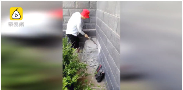 ▲動保人士費力的敲開新封的水泥,將狗救出。(圖/翻攝梨視頻)