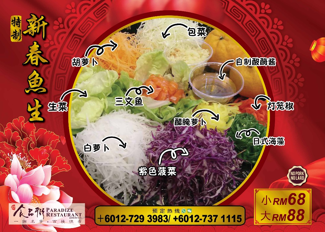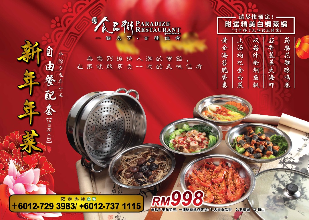 新春多人自由餐配套最低人数从40人起,每人仅需RM60,而且还提供送货服务!菜色也丝毫不马虎,竟然有多达8样菜肴和4样甜品!