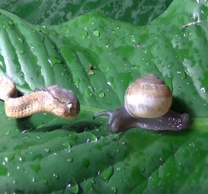 只見鈍頭蛇非常謹慎,先是頭抬高高、俯衝下來大口咬住蝸牛,毫無反擊能力的小蝸牛就這樣進了牠的嘴巴,然後是一段稍微漫長的吞嚥畫面,鈍頭蛇用巧勁把蝸牛從殼裡整隻拖出來,好不容易吃掉之後,還慢速咀嚼、旁邊剛好是一灘蝸牛黏液,就像是在喝湯一樣。