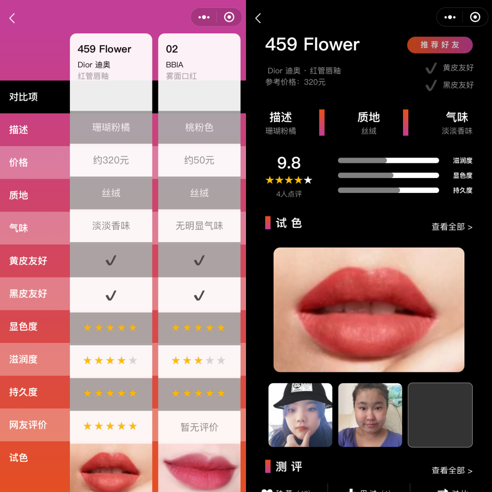 这根本就是专门给小资女们而设呀!这小程序呢就是可帮你找到梳妆台缺少的究竟哪些口红,你可以依据自己喜欢的口红进进测试~ 而且还能做对比等等,真的是还蛮不错的!