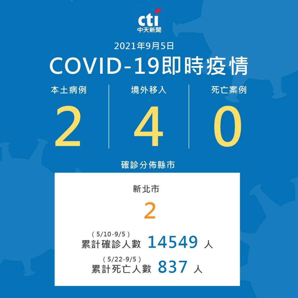 指揮中心表示,今日新增2例本土病例,分別為本國籍40多歲男性(案16128)及本國籍30多歲女性(案16129),2人為同住家人。案16128於今(2021)年9月1日出現咳嗽、發燒、頭痛及全身倦怠症狀,9月4日就醫採檢,於今日確診(Ct值24)。另,案16129於8月27日至8月29日期間出現咳嗽及味覺異常症狀,9月4日因案16128檢驗陽性,由衛生單位安排隔離並採檢,於今日確診(Ct值17)。衛生單位已匡列2人接觸者共50人,均列居家隔離,另有49人尚待風險評估後再行匡列,其餘相關接觸者匡列中。