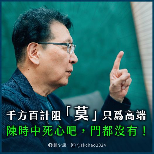 趙少康表示, 當初不買BNT是為了高端,現在不催莫德納也是為了高端,他們對高端還真是掏心掏肺、鞠躬盡瘁! 陳時中想給300萬的「莫粉」第二劑打高端,開了全世界的先例,我看還是死了這條心吧,門都沒有,這300萬人是不會同意的。