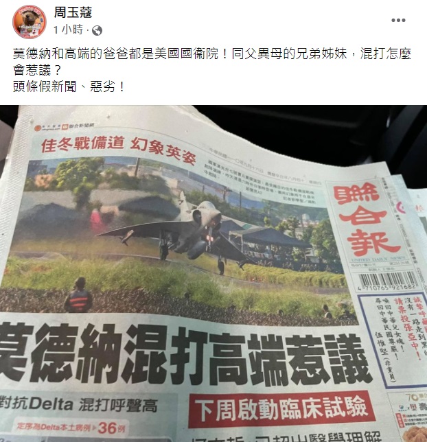 資深媒體人周玉蔻今稍早在臉書發文,並翻攝聯合報頭版標題「莫德納混高端惹議」,對此讓她大為不滿,她反駁「莫德納和高端的爸爸都是美國國衞院!同父異母的兄弟姊妹,混打怎麼會惹議?頭條假新聞、惡劣!」