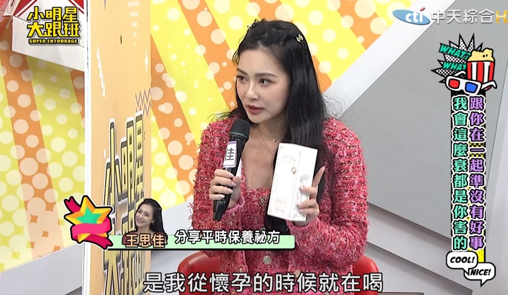 王思佳在節目中分享,她的產前產後愛用好物TKLAB嬌嬌飲!(圖/中天電視)