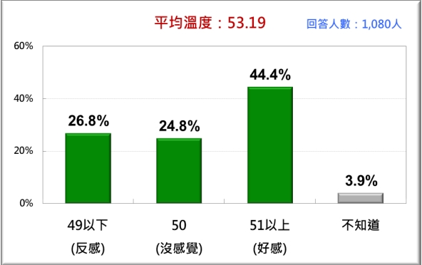 以民進黨來看,44.4%民眾對民進黨的感情溫度是51度以上,24.8%沒有感覺,26.8%的感覺是49度以下。換言之,最新民意顯示,在20歲以上台灣人中,有4成4對民進黨有好感,2成7反感,2成5無感。從平均溫度看,20歲以上台灣人對民進黨的感情溫度是53.19度。