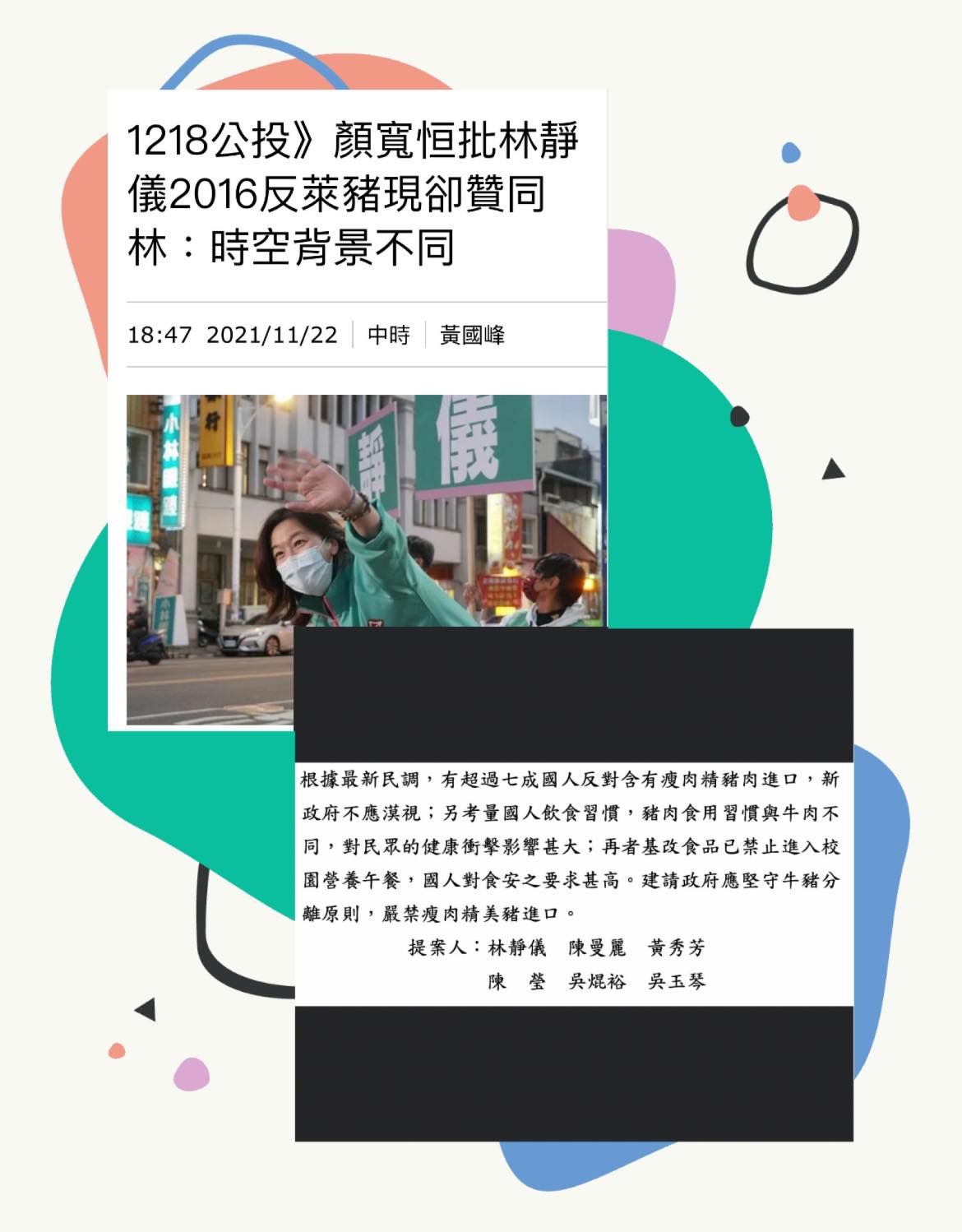 對此國民黨青年部副主任詹為元在臉書發文,林靜儀被抓包當立委時也反對萊豬進口,當時提案主文根本沒寫到擔心國內豬農好嗎?妳在騙三歲小孩嗎? 林靜儀不知道是「傻」還是「蠢」。