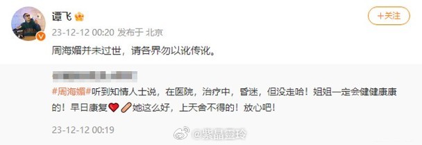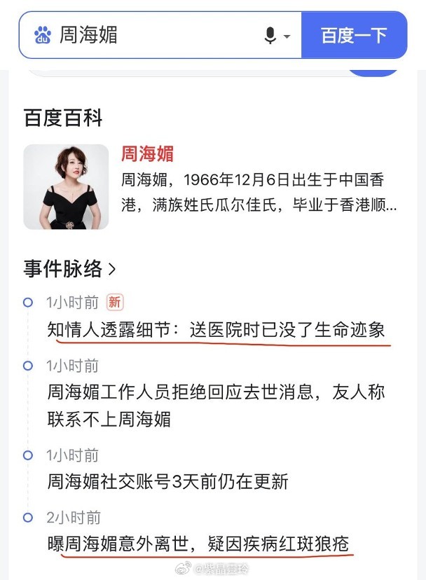 周海媚被誤傳離世噩耗 疑血小板問題暈倒送院57歲女星周海媚尋晚(11日)驚傳死訊,消息震驚中港台三地,加上其身邊工作人員均拒絕回應消息,令傳聞更加似層層。今日(12日)凌晨,內地著名編劇譚飛即出面代為闢謠:「周海媚未過世,請各界勿以訥傳訛。」前TVB時政記者亦網上闢謠,指周海媚仍喺醫院治療中、昏迷中,不過周海媚工作室仍未就傳聞發言。同時,最早傳出周海媚離世噩耗嘅爆料者亦已將該發文刪除。隨後網上即傳出周海媚尋日因血小板問題而喺北京順義家中暈倒,一度昏迷,工作人員即急急將佢送院,經幾小時搶救後已經脫離危險期,不過消息未被周海媚方證實。稍早,網上有傳曾周海媚係因紅斑狼瘡症誘發急性病而「離世」,不過有網友搵出昔日周海媚就曾闢謠患紅斑狼瘡一事,以正視聽。周海媚驚傳死訊,網上生平更已被更改。周海媚工作室仍未就傳聞發言。內地著名編劇譚飛闢謠,指周海媚未死。有傳周海媚因血小板問題暈倒送院,現已脫離危險期。所有消息均未被周海媚方證實。周海媚